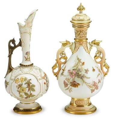 Comprising a tall ewer and covered twin-handled vase, both enameled to show floral sprays with gilt highlights.