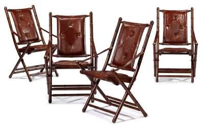 Each worked to simulate bamboo, with leather strap arms and tufted leather back and seat.