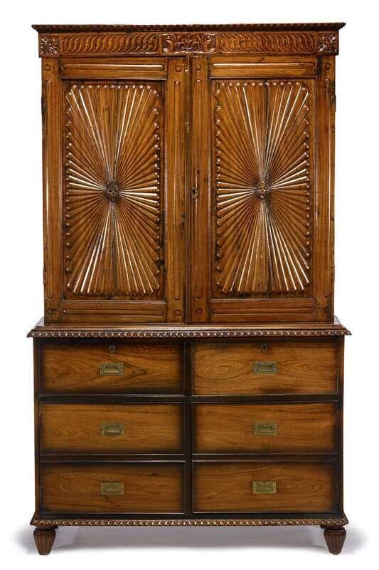 In two parts: the upper section with fan molded cupboard doors, the base with two banks of three short drawers with campaign handles raised on short fluted feet.
