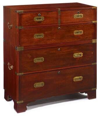 In two sections, with two short drawers over three graduated long drawers, raised on bracket feet.