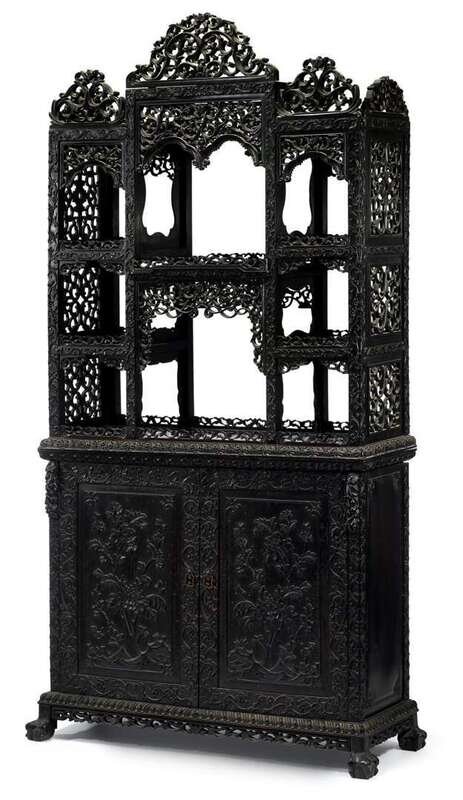 The reticulated and floral scroll carved and pierced multi-tiered uper section over a floral scroll carved cabinet with two cupboard doors, raised on claw and ball feet.
