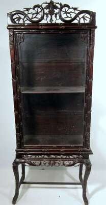 In two parts: the upper section with single glazed door and glazed side panels enclosing three shelves, raised on stand supported by cabriole legs, carved all over to simulate bamboo.