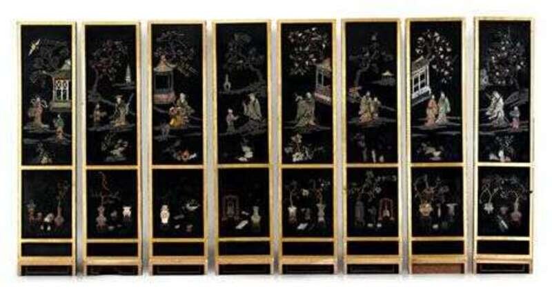 Large Chinese eight panel black lacquer, gilt-metal and stone applied floor screen 19th century