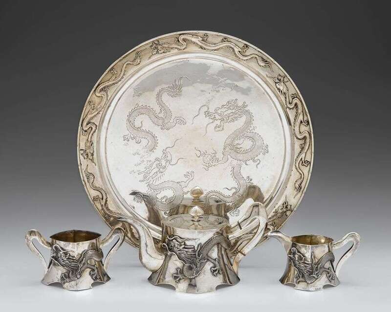 Comprising a teapot, creamer, and sugar, all of shaped cube form with applied dragons, Zee Wo and character marks to undersides; together with a conforming silver tray, with a bamboo-form edge, engraved to the center to show dragons flying around a flaming pearl, character marks to underside.