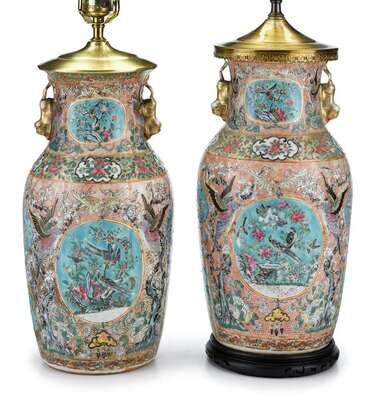 Converted to lamps, foliate and bird turquoise ground cartouche to pink glazed ground, over wood stands.