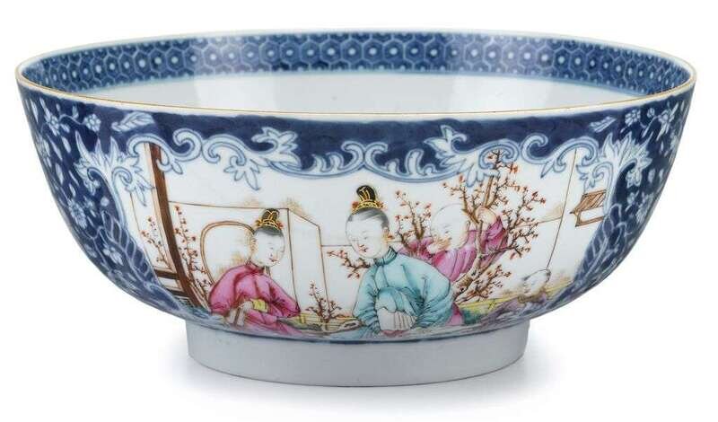 Typical U-shape, the sides decorated in blue and white surrounding figural cartouches.