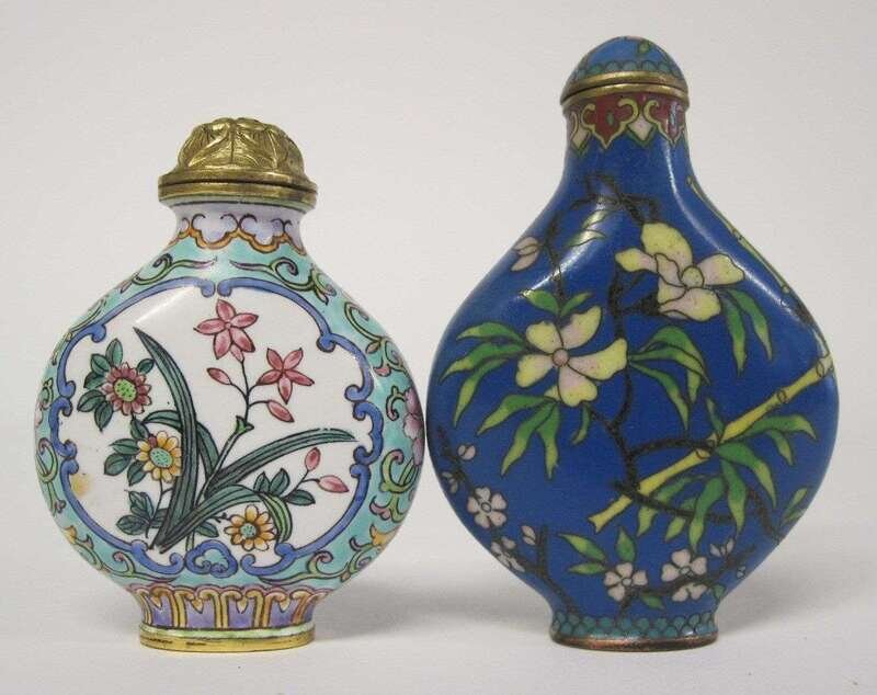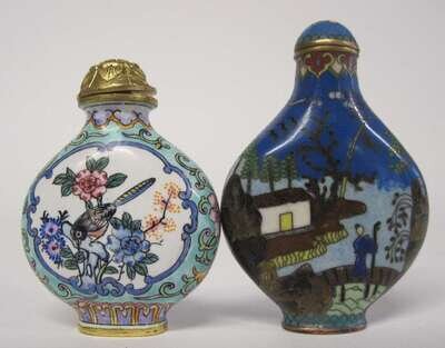 Comprising a larger cloisonne enamel snuff, together with a Canton enamel snuff (2).