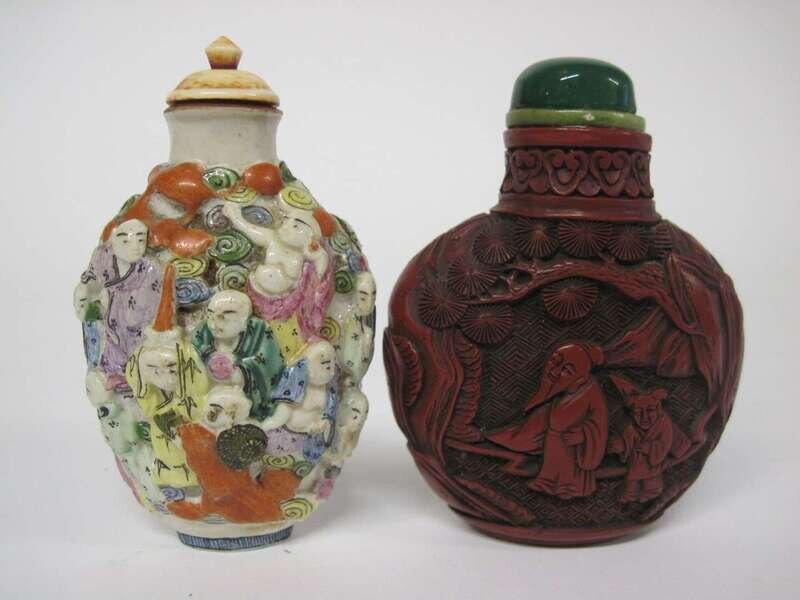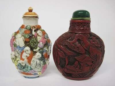 Comprising a large cinnabar lacquer snuff bottle heavily carved to show figures in a stylized mountain landscape and a carved and enameled porcelain snuff showing an assemblage of luohan.