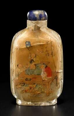 The rounded rectangular bottle with natural cracks and fissures painted with scene of rowdy students misbehaving around their sleeping teacher; inscribed.