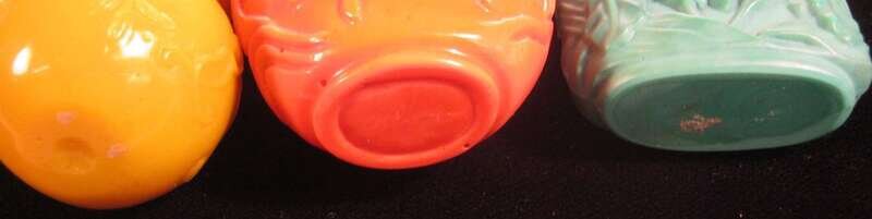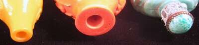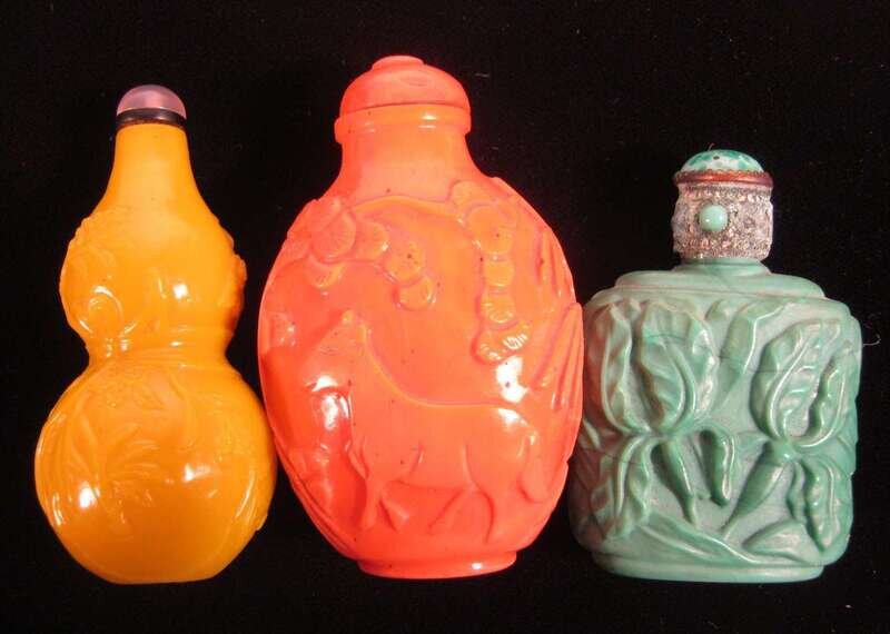 Comprising a simulated coral snuff, yellow glass snuff and European scent bottle.