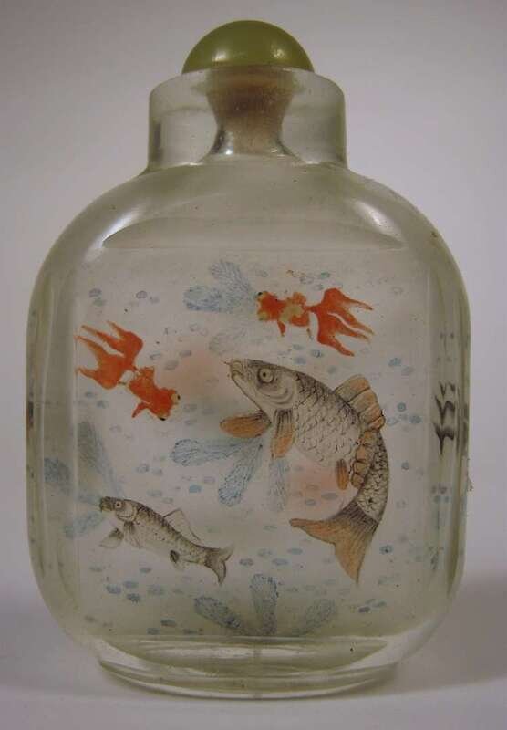 Associated stopper, wide facted glass bottle paimnted to show aquotic scenes.