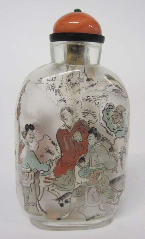Coral tone stopper over baluster bottle painted to show figural scene.