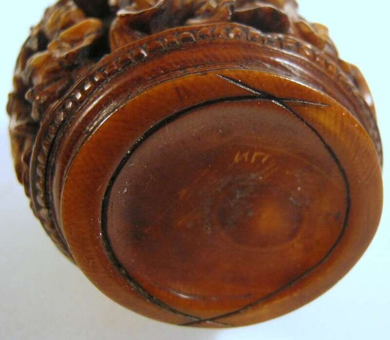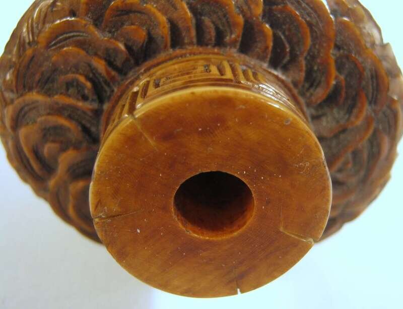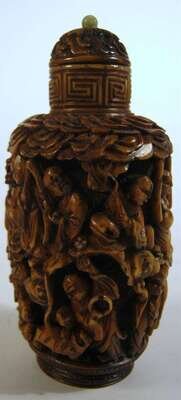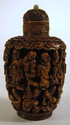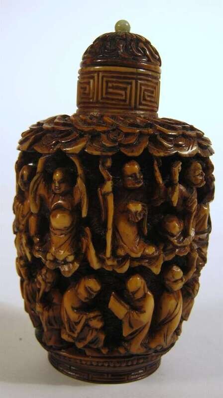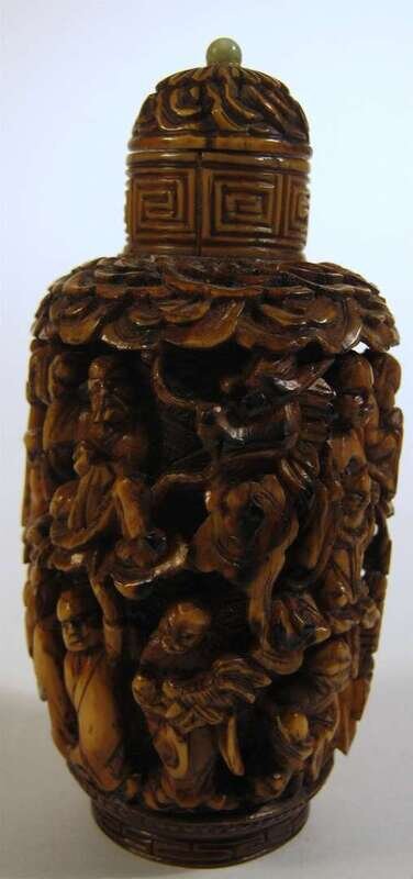 The openwork bottle carved to surface with full body depictions of the luohan between clouds at shoulder and geometric bands at neck and foot; with matching cap.
