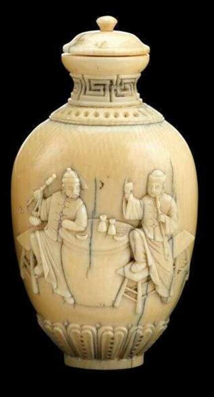Flattened dome cover over baluster base carved in high relief to show court figures.