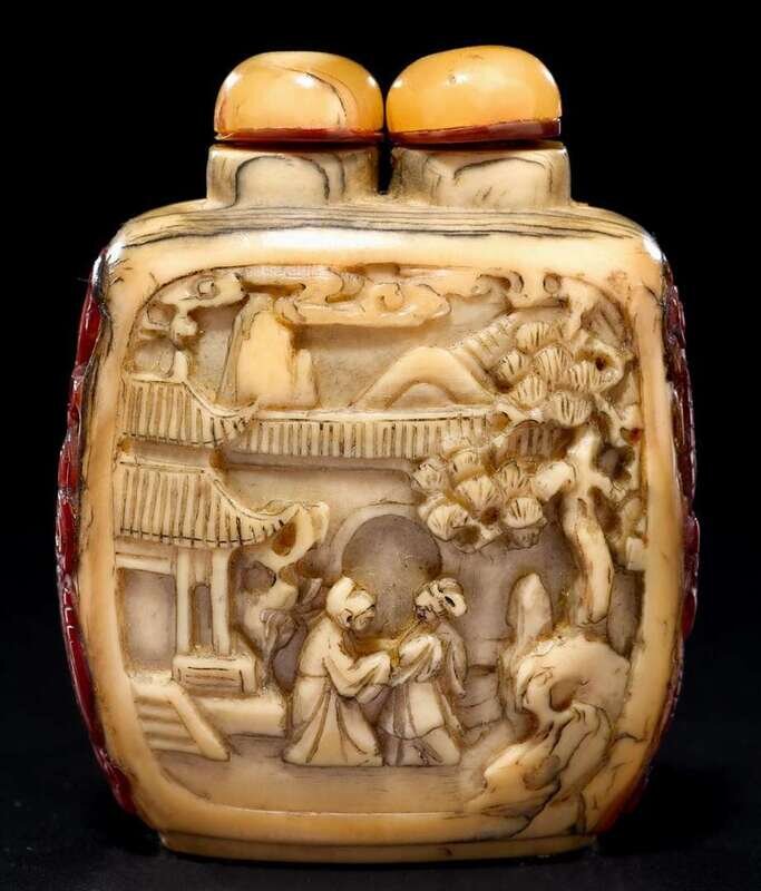 The rectangular bottle carved with figural landscape to face and owl on tree top to verso.