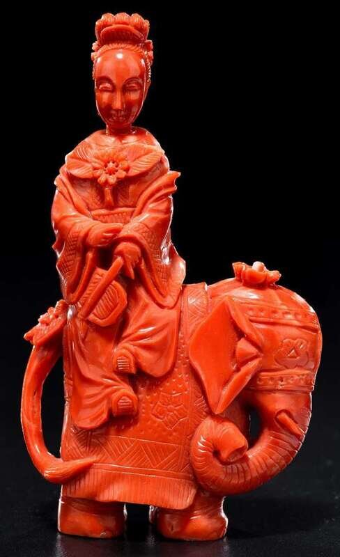 The bottle carved as a meiren riding an elephant, the mobile head as bottle cap.