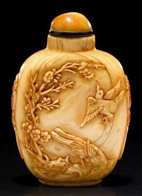 Domed stopper over baluster bottle carved to show song bird and floral blossoms, ring handles carved to shoulders.