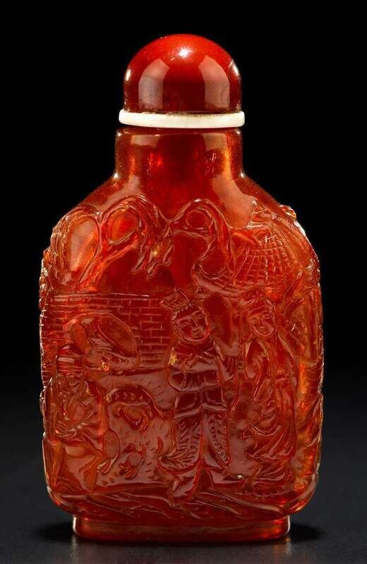 Baluster form, well carved to show figural landscape, raised on wide oval foot.