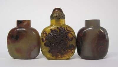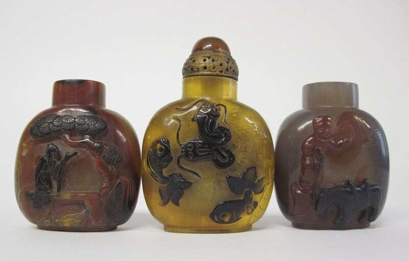 Three of brown hue carved in medium relief, the largest showing koi amongst lotus blossoms.