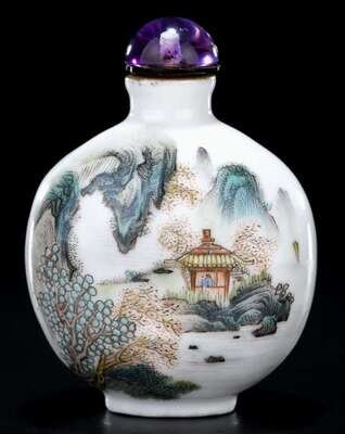 Wide ovoid form enemaled to show village hamlet with poetic script verso.
