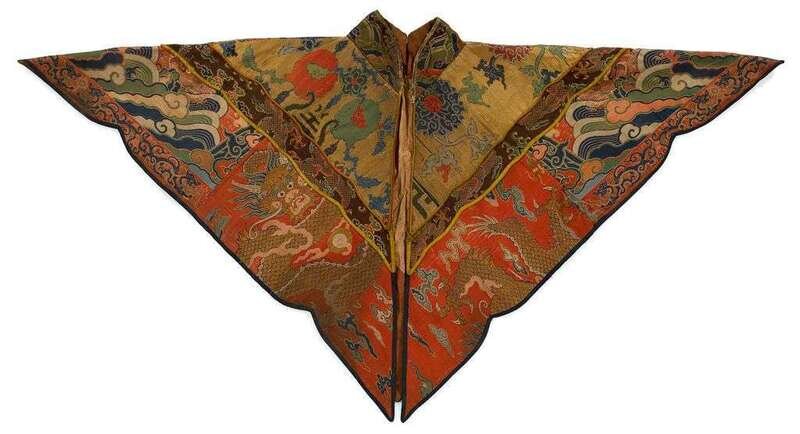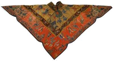 The triangular cloak embroidered with dragons, peach and flower blossoms, lishui bands and cloud motifs.