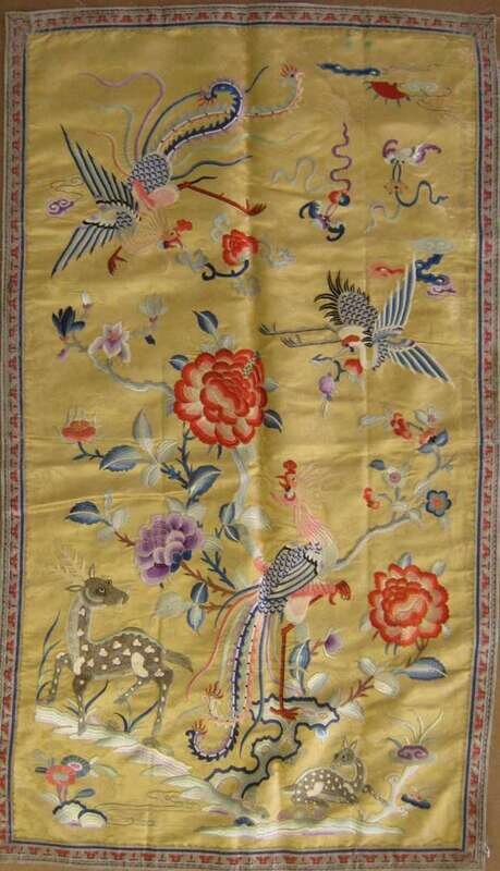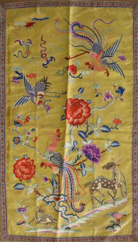 The yellow-ground rectangular panel embroidered with phoenix, a crane and deer among many large blossoms.