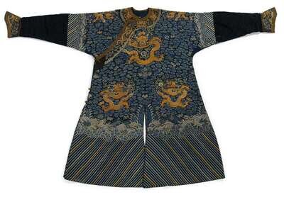 Guaze woven in gilt thread and colored silk with dragons chasing flaming pearls among clouds and fu bats, above sea wave borders and with horse shoe cuffs.