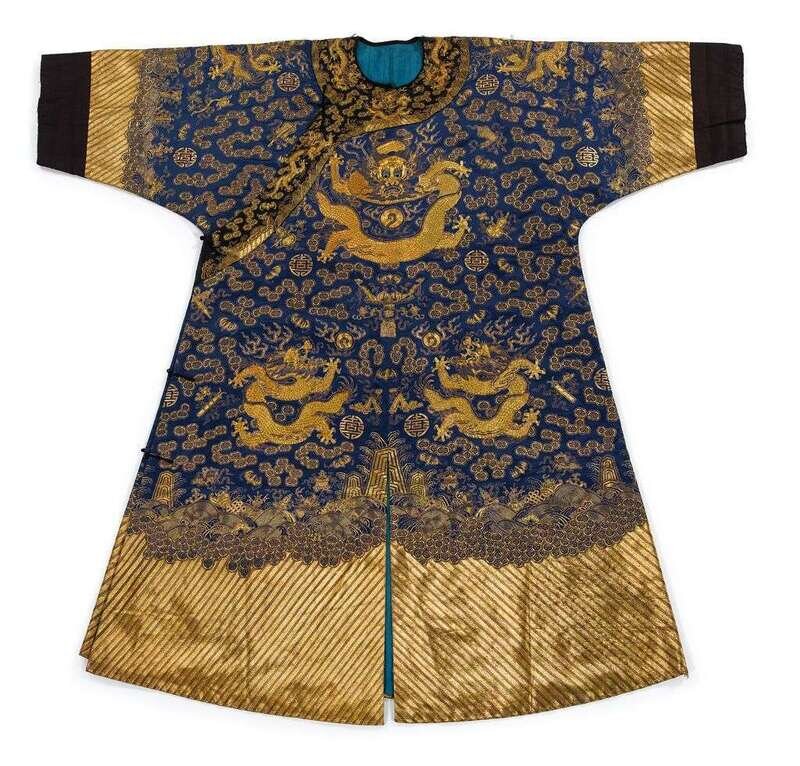 Chinese gilt thread on blue satin dragon robe qing dynasty