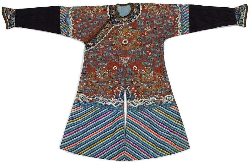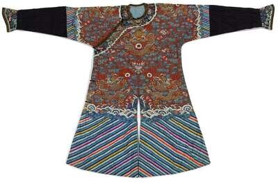 Of typical form woven with dragons in pursuit of pearls among multicolor silk clouds, fu bats, and daoist symbols above wave and rock band; with horse shoe cuffs.
