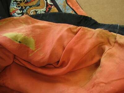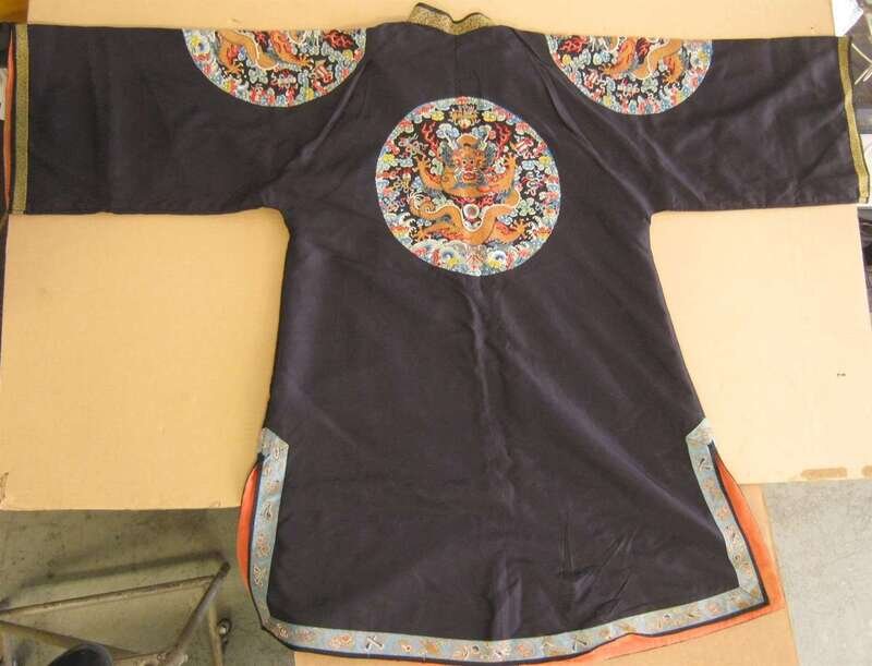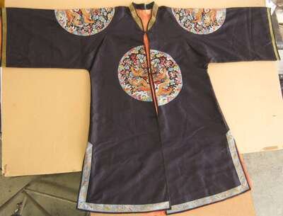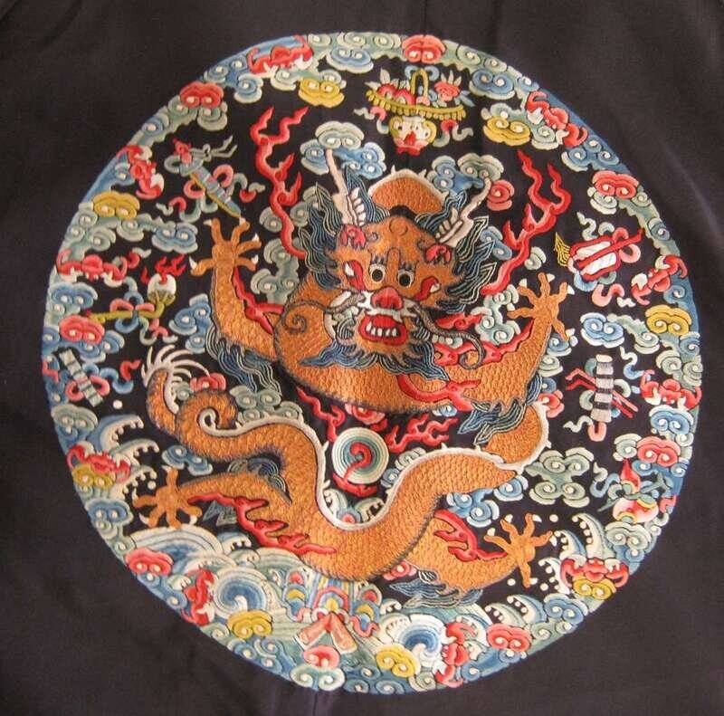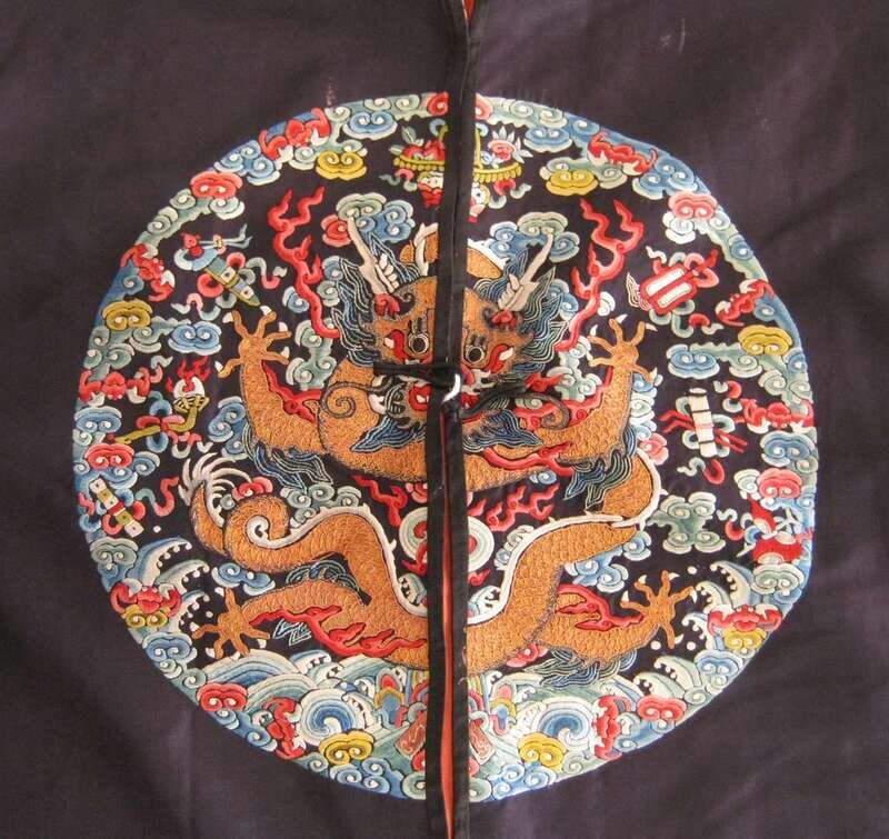 Woven in colored silks and gilt thread on midnight blue brocade, with dragon among clouds roundrels to chest, back and both shoulders, and a border of buddhist and daoist emblems near base.