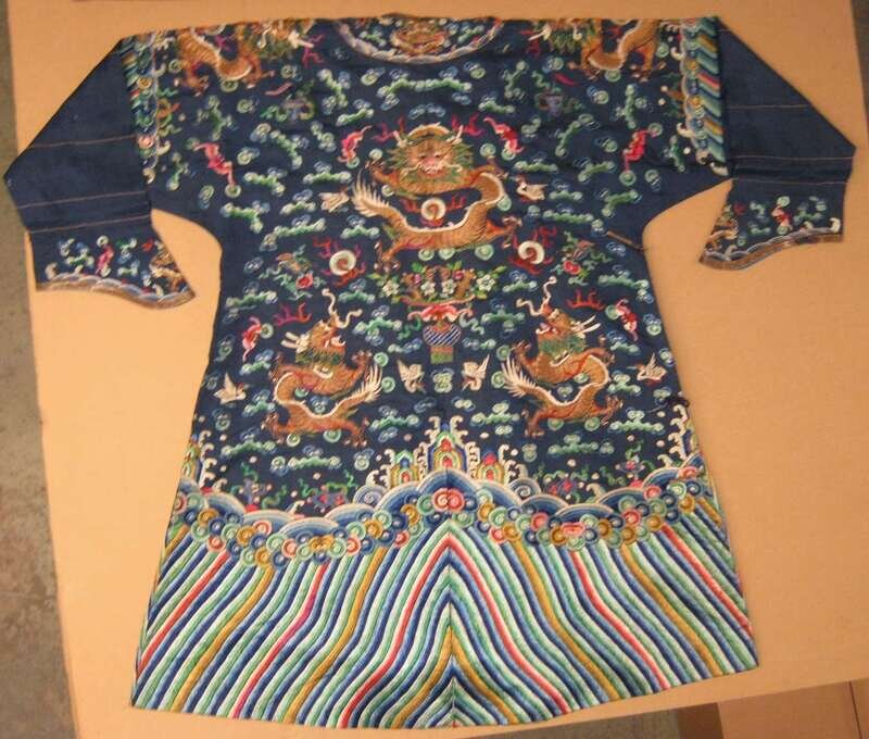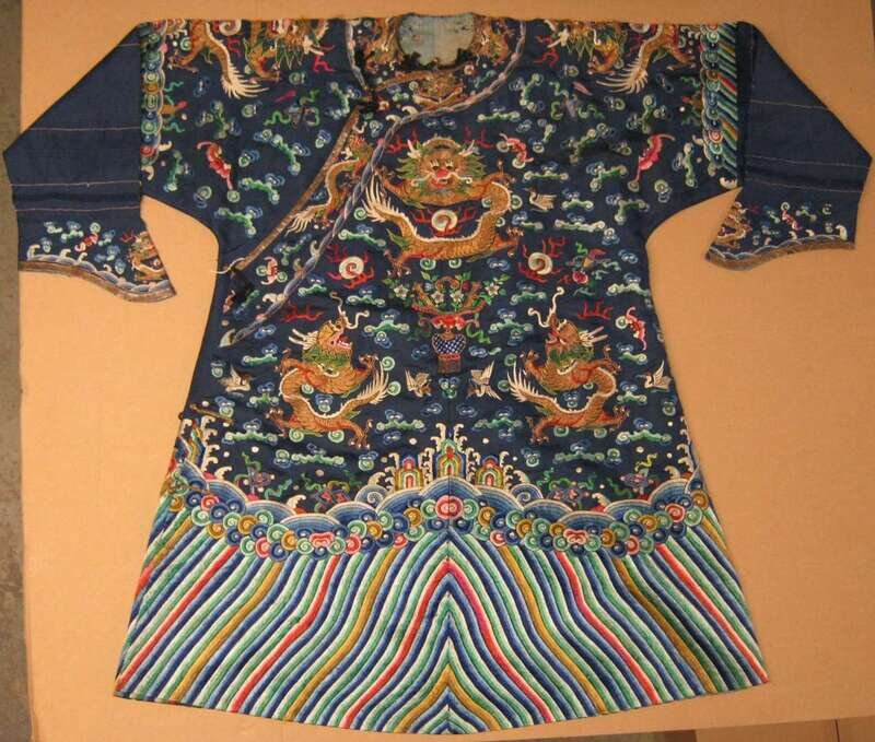 The diminutive robe of typical dragon design with a wide lishui band and metallic thread highlights.