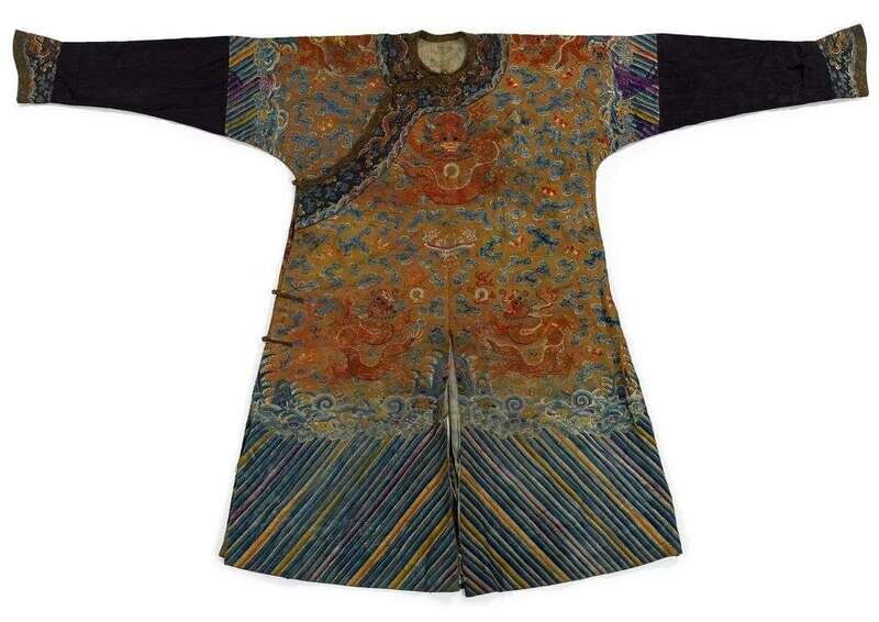 The imperial-style robe embroidered throughout to show dragons, fu bats, and other auspicious symbols on a gold ground among clouds above a rock and wave band over a wide lishui border.
