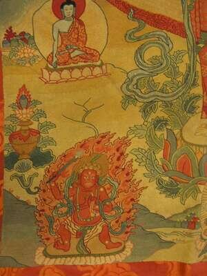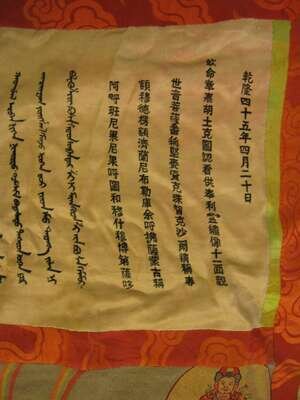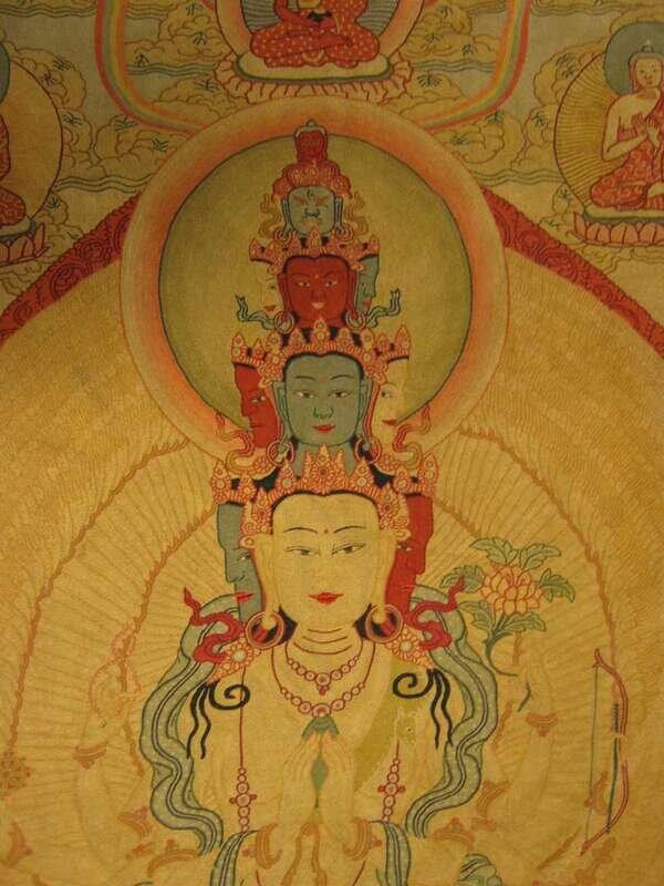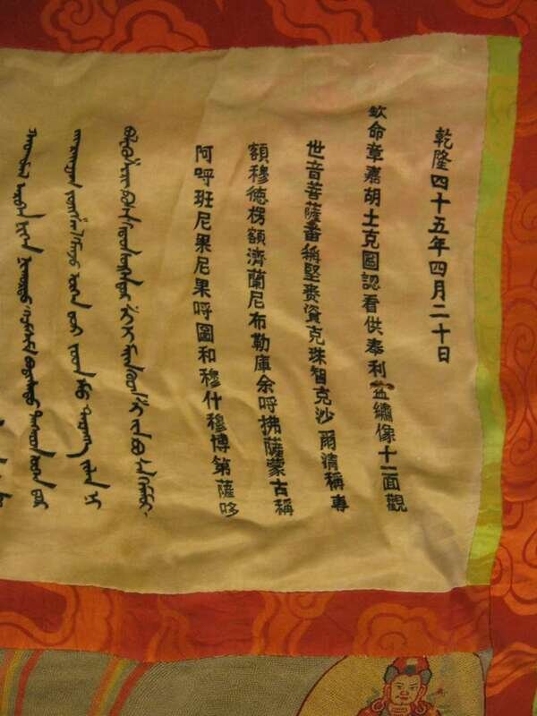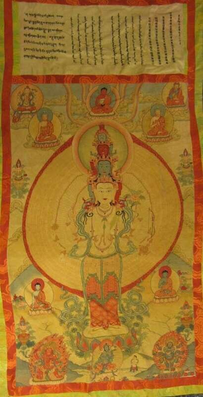 Tall rectangular form, the blue brocade band frames a tightly woven fiber panel depicting standing Bodhisattva (Avalokitesvara) flanked by radiating halo and celestial deity, banded at the top by woven script.