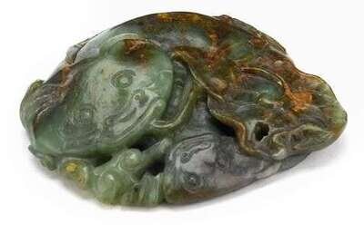 Rounded pebble form carved in high relief and openwork to show coiled catfish with lotus pad, fine detail verso.