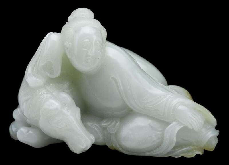 Recumbent deity over horse, fine detail to face and mane, slight brown skin to body.