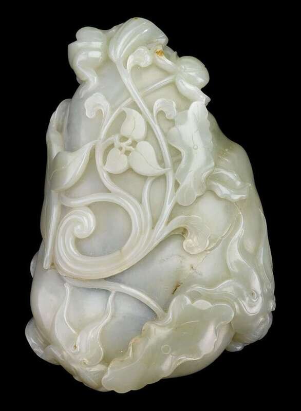 Wide lotus blossom form, with shapely everted rim supporting various frog, fish and pod, the underside deeply carved to show detailed vine work and blossoming leaves.