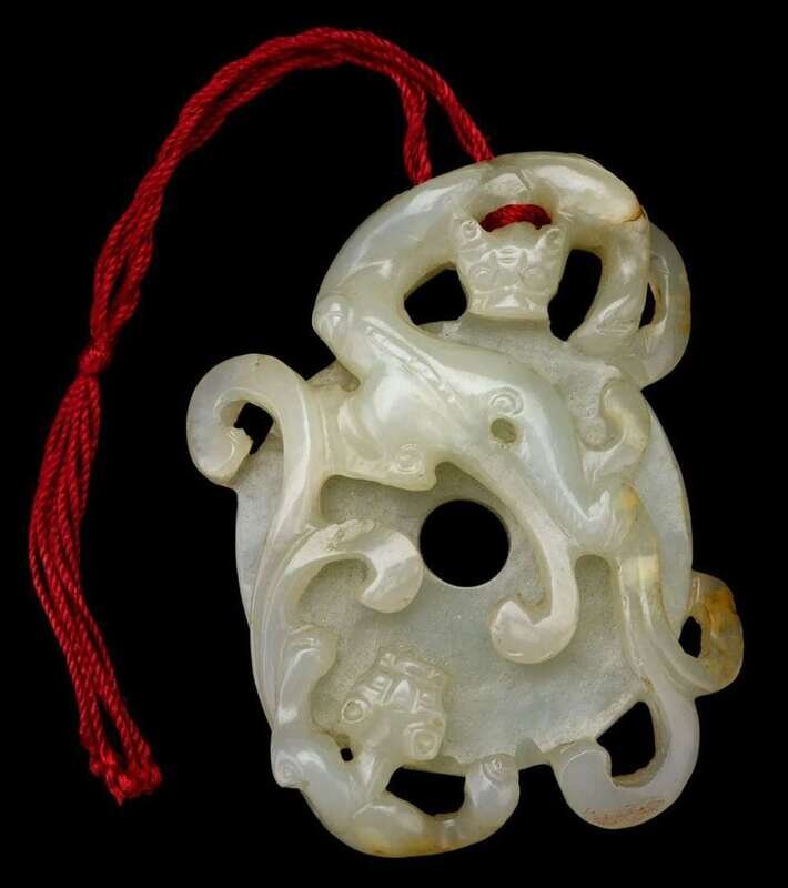 Bi disk carved with millet to underside, flanked by two coiled qilong.