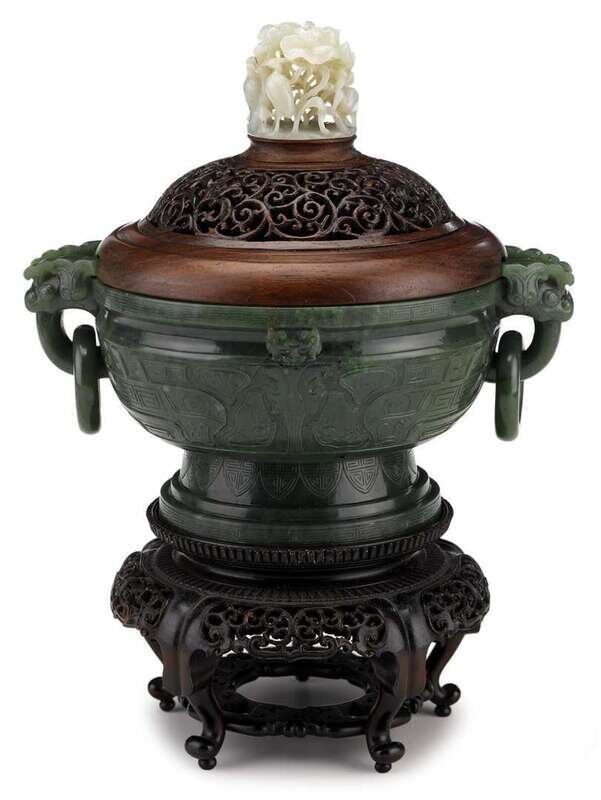 Fine Chinese spinach jade censer with white jade finial and hardwood cover 18th century