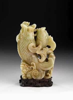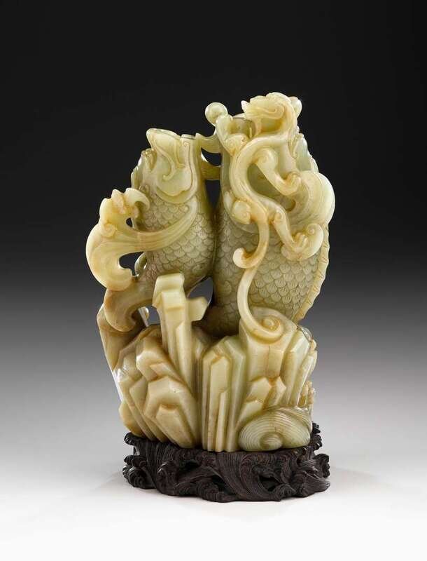 Single section grouping carved in high relief to show graduating leaping carp issuing scrolling fins supporting bats and scaling qilong beast to mouth, all over facted celestial rockwork, scrolling sea carved to base with incised Qianlong mark in a line, wood stand.