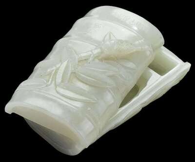 Two parts, the cover carved to show bamboo sprig and cicarda, inscribed 'Ethical is a Gentleman and titled bamboo and cicada' revealing and interior carved for ink stick.