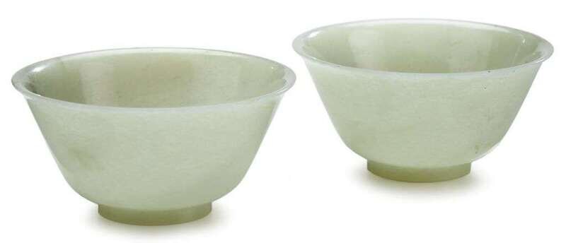 Pair of unusual 'oil spot' light celadon jade bowls 18/19th century