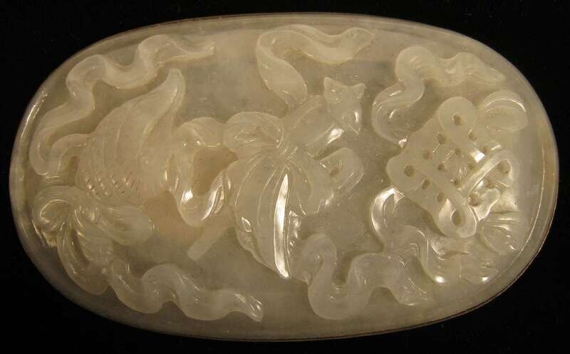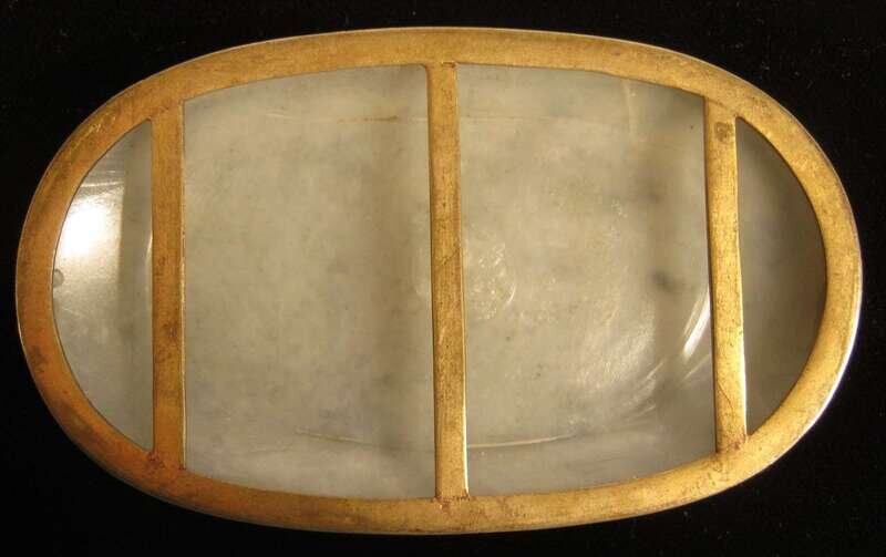 Oval white panel carved to show three Buddhistic symbols, gilt bronze mounts.
