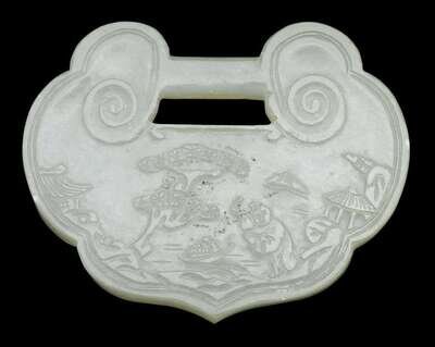 The ruyi-head lock carved in relief with a scholar in a riverside landscape, and inscribed to verso.