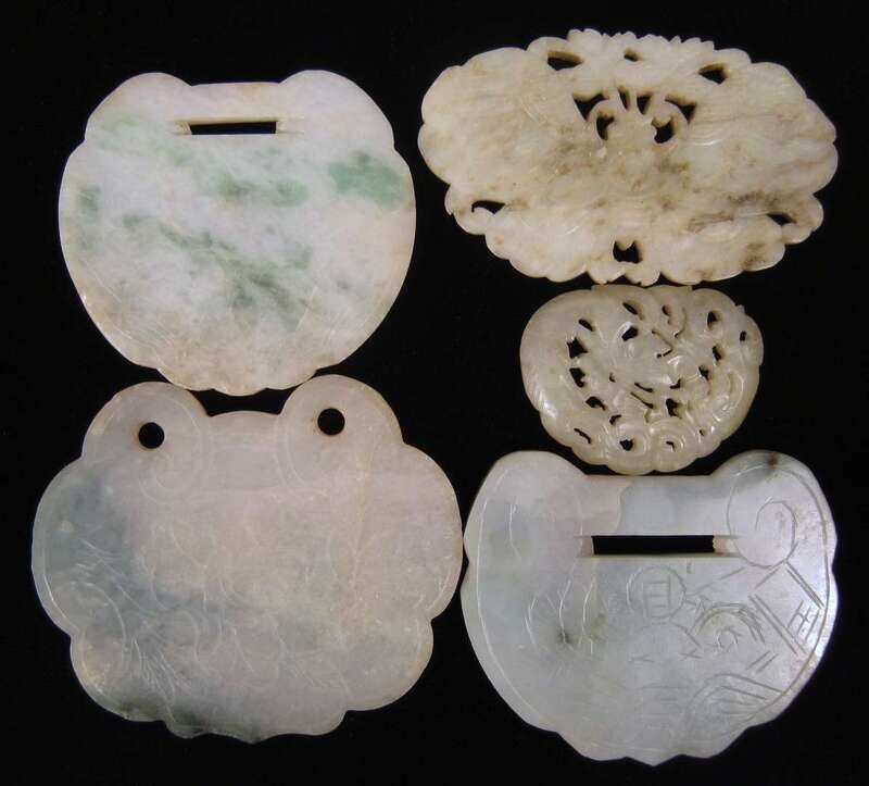 Comprising three speckled green ruyi-head form locks, a pierced mottled jade butterfly and a pierced oval disc.
