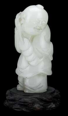 Tall standing figure grasping a ribbon tied chain of coins, good hue.