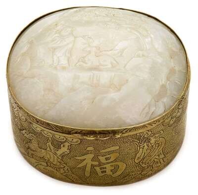 The oval and convex white jade plaque carved to show a figure with deer in a rocky landscape; set in brass oval box of later manufacture.