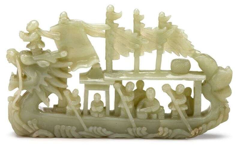 The flattened vessel carved as a four-masted boat with a dragon head and tail and with several small Buddhist monk passengers; finely-detailed roiling waves carved at base.