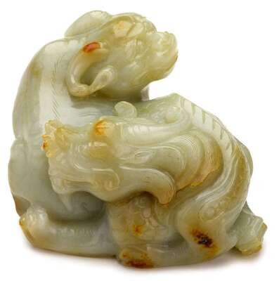Carved to depict a dragon and horned beast intertwined; jade of celadon hue with brown russets.