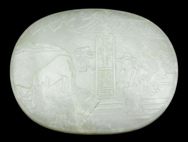 Oval and convex surface carved in light relief to depict a figure and horse outside a house.