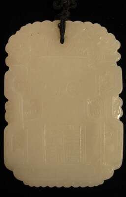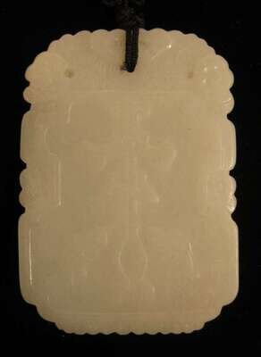 Shaped rectangular form, carved to show panel of twin kissing fish and script verso under scrolling ends.
